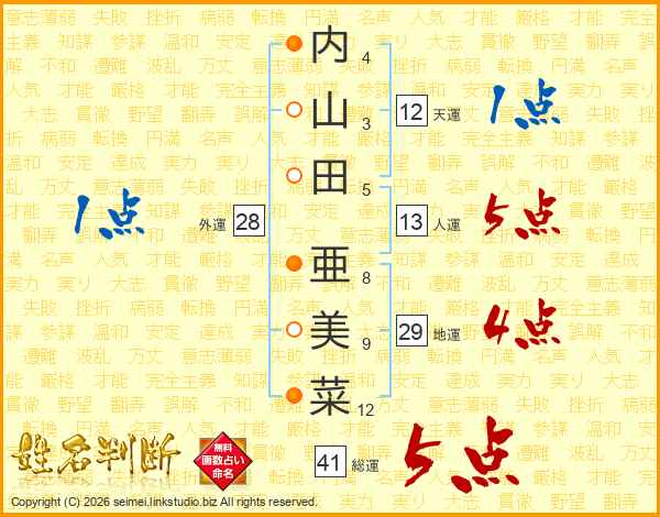 内(4画)山(3画)田(5画) 亜(8画)美(9画)菜(12画)