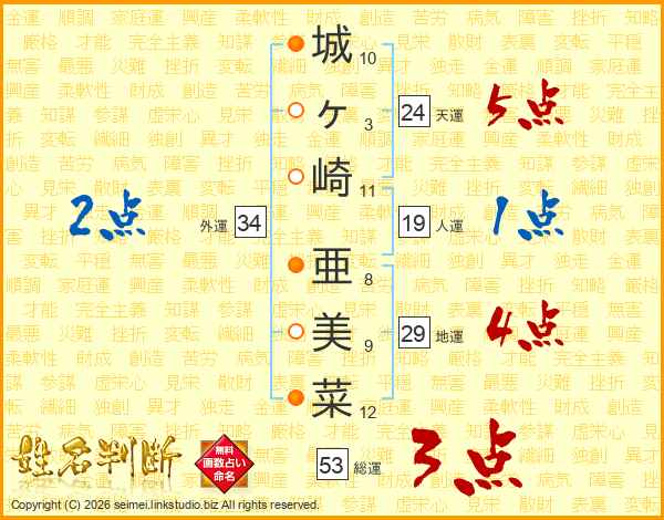 城(10画)ヶ(3画)崎(11画) 亜(8画)美(9画)菜(12画)