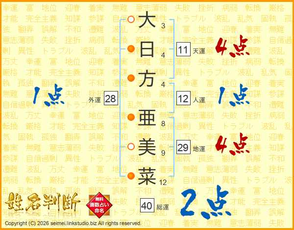 大(3画)日(4画)方(4画) 亜(8画)美(9画)菜(12画)