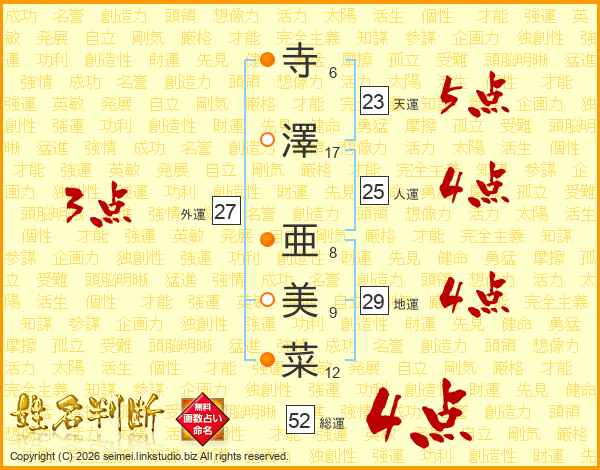 寺(6画)澤(17画) 亜(8画)美(9画)菜(12画)