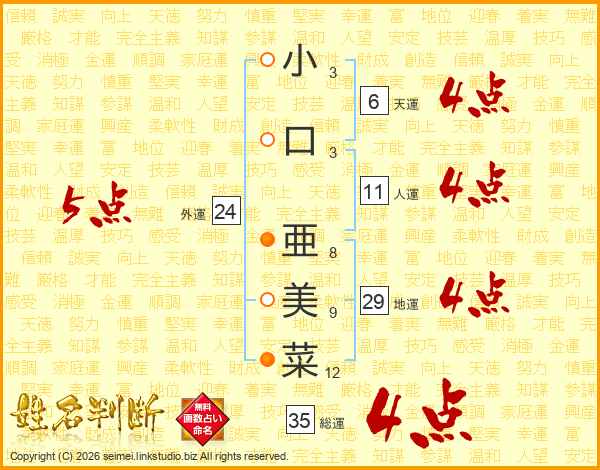 小口亜美菜さんの総運は35画の4点!