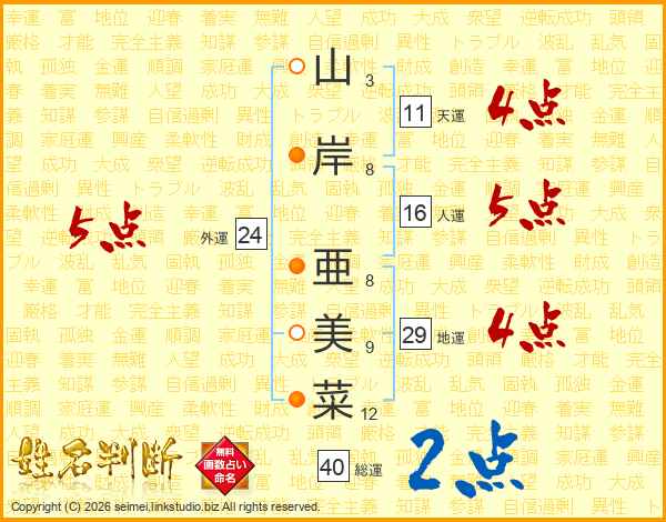 山(3画)岸(8画) 亜(8画)美(9画)菜(12画)