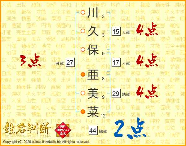 川(3画)久(3画)保(9画) 亜(8画)美(9画)菜(12画)