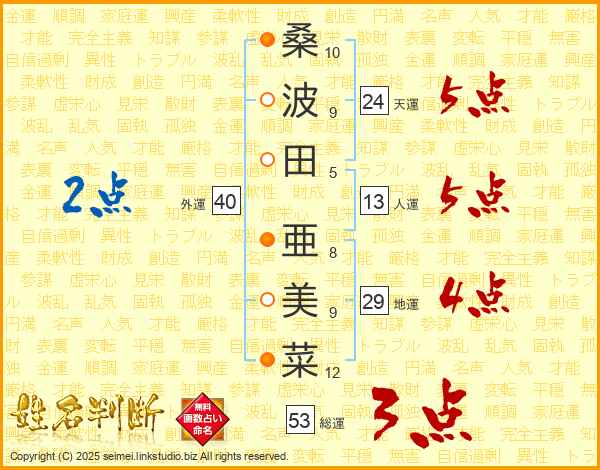 桑(10画)波(9画)田(5画) 亜(8画)美(9画)菜(12画)