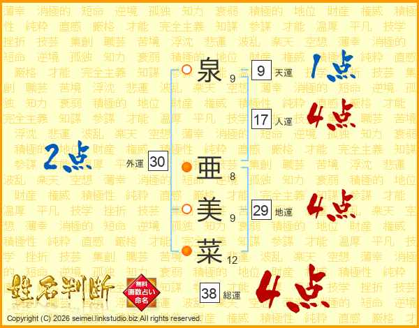 泉(9画) 亜(8画)美(9画)菜(12画)