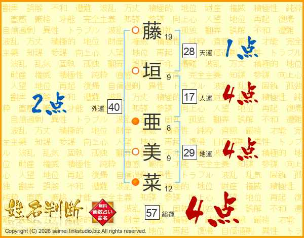藤(19画)垣(9画) 亜(8画)美(9画)菜(12画)