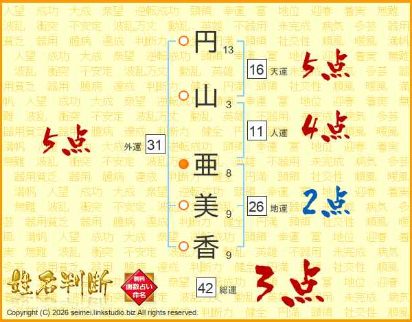 円(13画)山(3画) 亜(8画)美(9画)香(9画)
