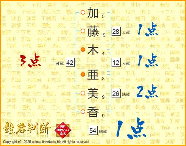 加(5画)藤(19画)木(4画) 亜(8画)美(9画)香(9画)