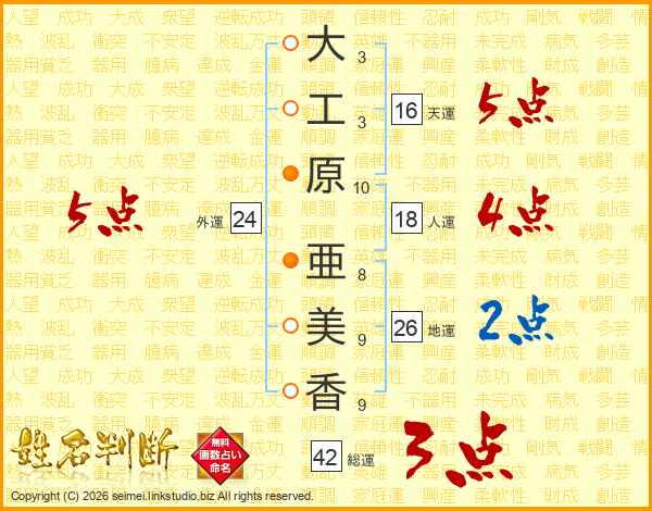 大(3画)工(3画)原(10画) 亜(8画)美(9画)香(9画)