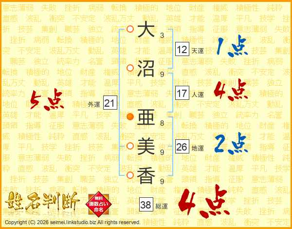 大(3画)沼(9画) 亜(8画)美(9画)香(9画)