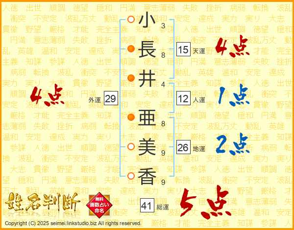 小(3画)長(8画)井(4画) 亜(8画)美(9画)香(9画)