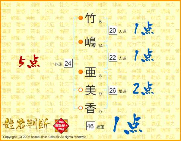 竹(6画)嶋(14画) 亜(8画)美(9画)香(9画)