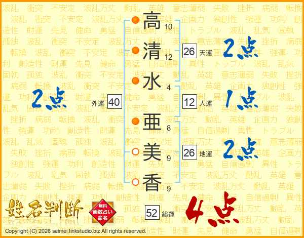 高清水亜美香さんの天運は26画の2点!