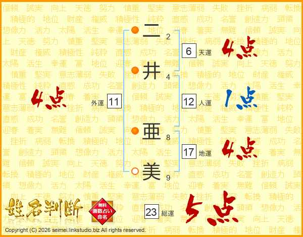 二井亜美さんの総運は23画の5点!