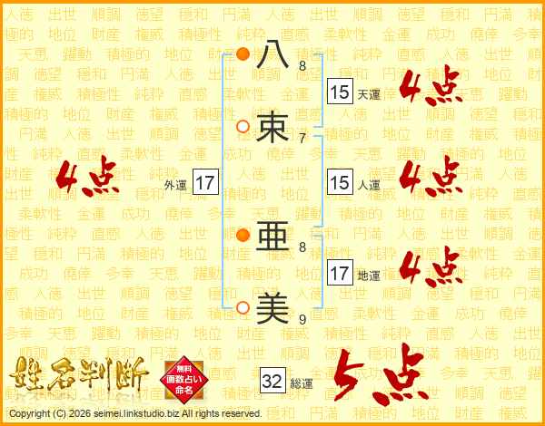 生活面を象徴する運勢です。外部から受ける影響力を表し、結婚運、家庭運や職場、環境への順応性を表します。総運から人運を引いた画数。姓や名が1文字の場合を除く。