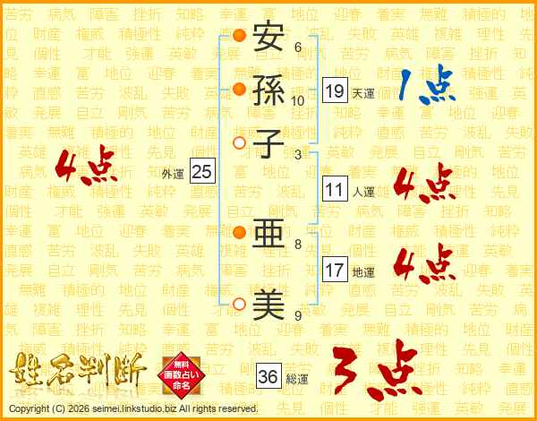 安(6画)孫(10画)子(3画) 亜(8画)美(9画)