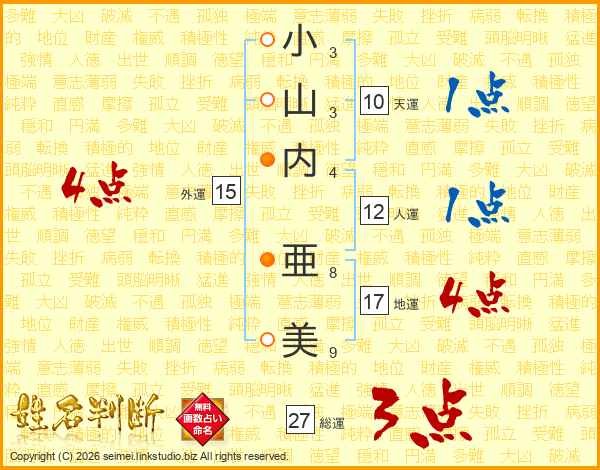 小(3画)山(3画)内(4画) 亜(8画)美(9画)