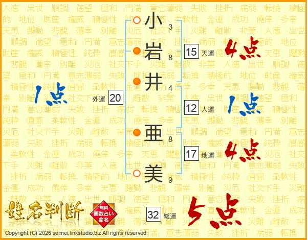 小(3画)岩(8画)井(4画) 亜(8画)美(9画)