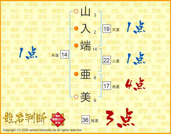 山(3画)入(2画)端(14画) 亜(8画)美(9画)