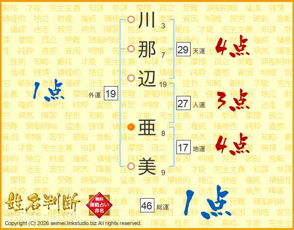 川(3画)那(7画)辺(19画) 亜(8画)美(9画)