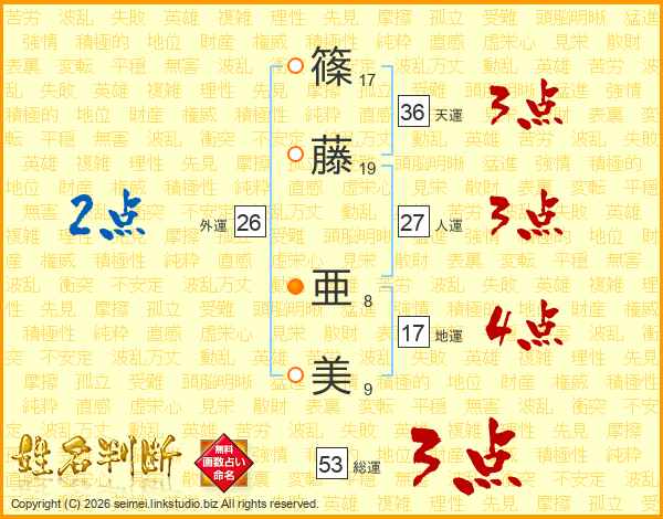 篠(17画)藤(19画) 亜(8画)美(9画)