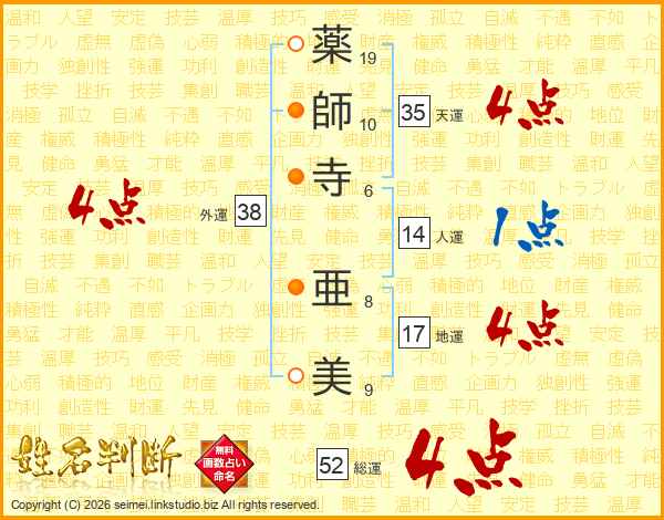 薬(19画)師(10画)寺(6画) 亜(8画)美(9画)