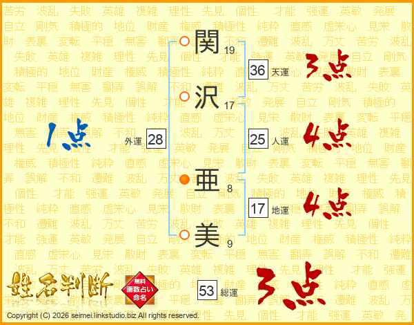 生活面を象徴する運勢です。外部から受ける影響力を表し、結婚運、家庭運や職場、環境への順応性を表します。総運から人運を引いた画数。姓や名が1文字の場合を除く。