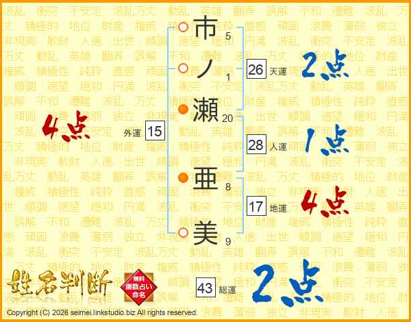 市(5画)ノ(1画)瀬(20画) 亜(8画)美(9画)
