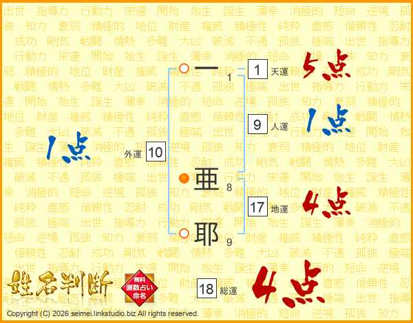 生活面を象徴する運勢です。外部から受ける影響力を表し、結婚運、家庭運や職場、環境への順応性を表します。総運から人運を引いた画数。姓や名が1文字の場合を除く。