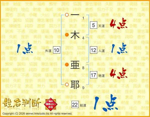 一(1画)木(4画) 亜(8画)耶(9画)