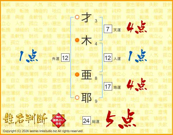 才(3画)木(4画) 亜(8画)耶(9画)