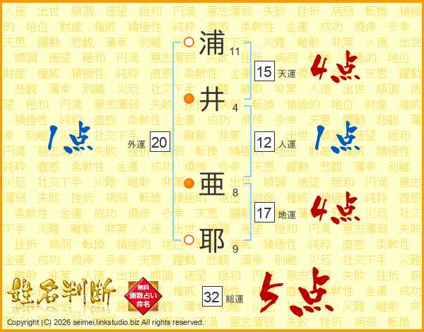 浦(11画)井(4画) 亜(8画)耶(9画)