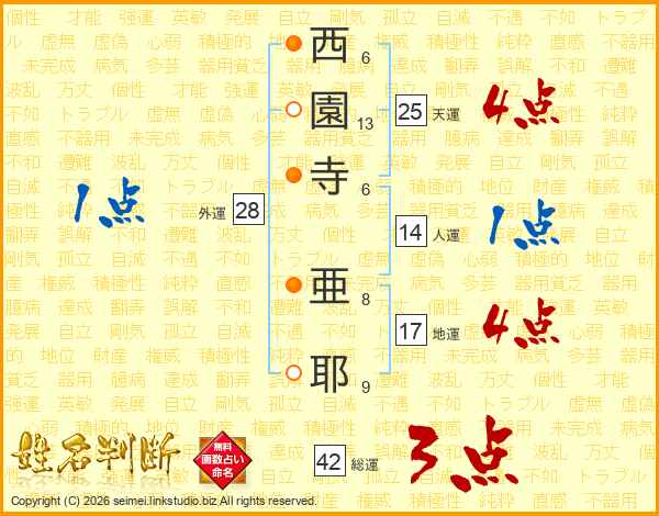 西(6画)園(13画)寺(6画) 亜(8画)耶(9画)
