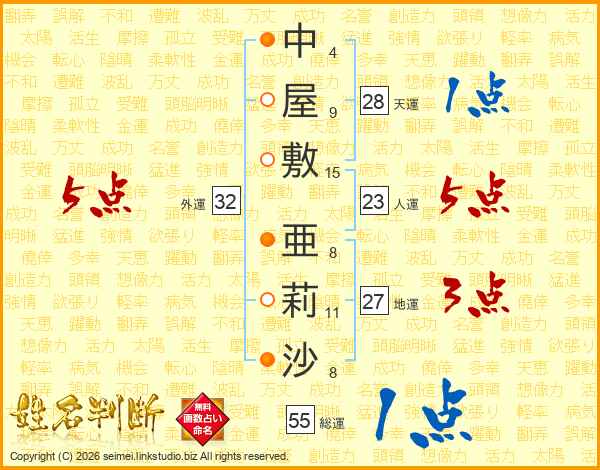 中屋敷亜莉沙さんの外運は32画の5点!
