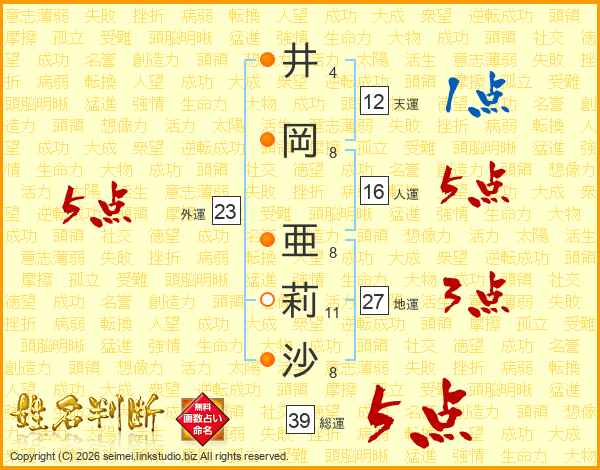 井岡亜莉沙さんの総運は39画の5点!