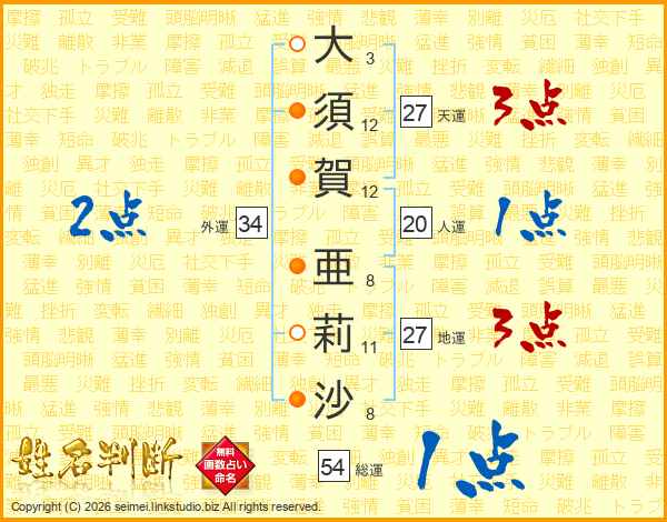 大(3画)須(12画)賀(12画) 亜(8画)莉(11画)沙(8画)