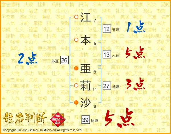 江本亜莉沙さんの総運は39画の5点!