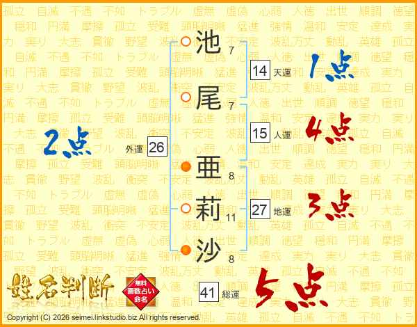 池(7画)尾(7画) 亜(8画)莉(11画)沙(8画)