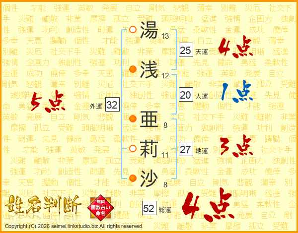 湯(13画)浅(12画) 亜(8画)莉(11画)沙(8画)