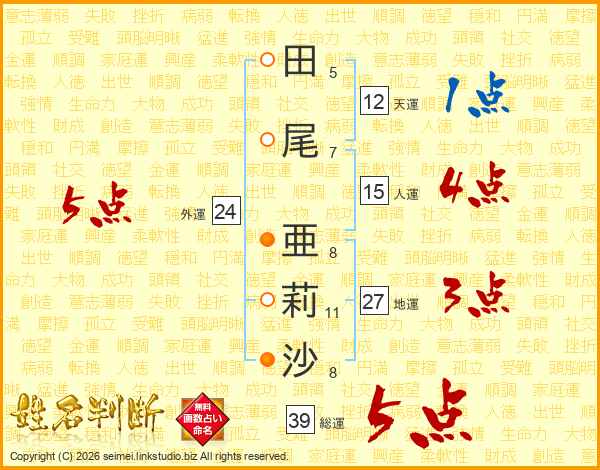 田(5画)尾(7画) 亜(8画)莉(11画)沙(8画)