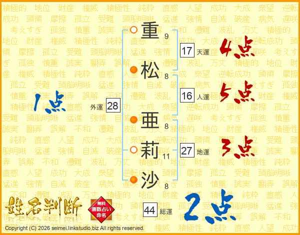 重(9画)松(8画) 亜(8画)莉(11画)沙(8画)