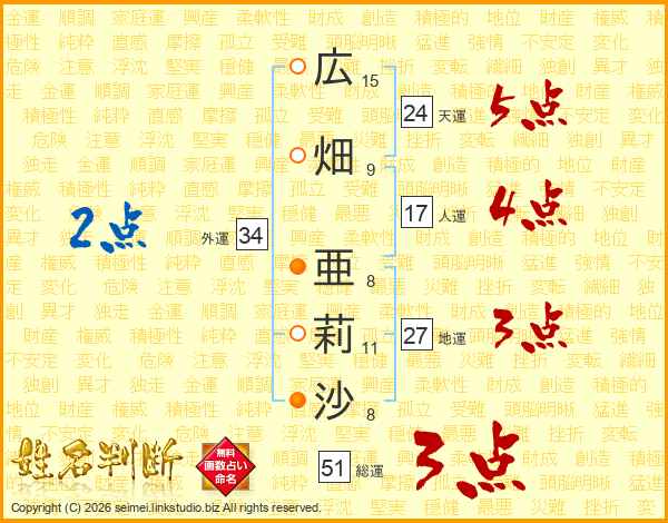 広(15画)畑(9画) 亜(8画)莉(11画)沙(8画)