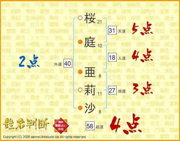 桜(21画)庭(10画) 亜(8画)莉(11画)沙(8画)