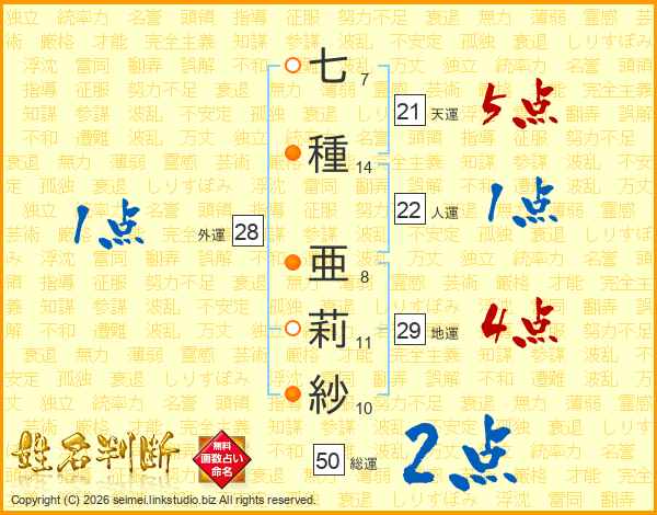 七種亜莉紗さんの総運は50画の2点!
