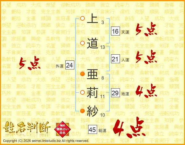 上(3画)道(13画) 亜(8画)莉(11画)紗(10画)