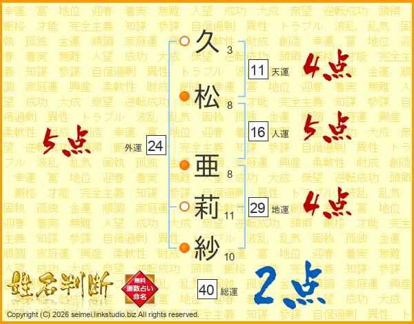 久(3画)松(8画) 亜(8画)莉(11画)紗(10画)
