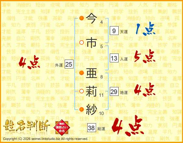 今市亜莉紗さんの総運は38画の4点!