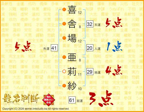 喜(12画)舎(8画)場(12画) 亜(8画)莉(11画)紗(10画)
