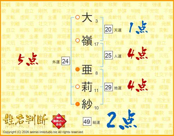 大(3画)嶺(17画) 亜(8画)莉(11画)紗(10画)