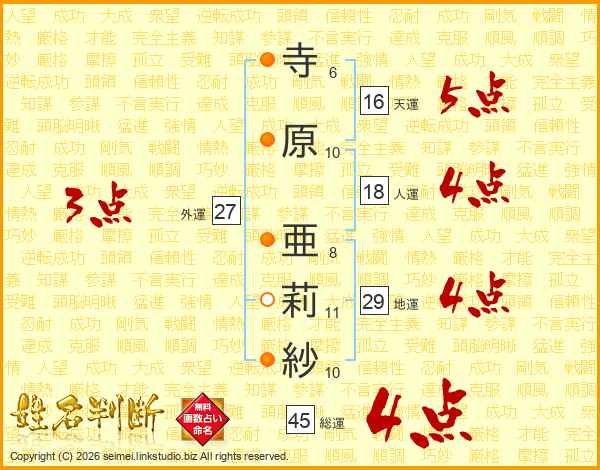 寺(6画)原(10画) 亜(8画)莉(11画)紗(10画)
